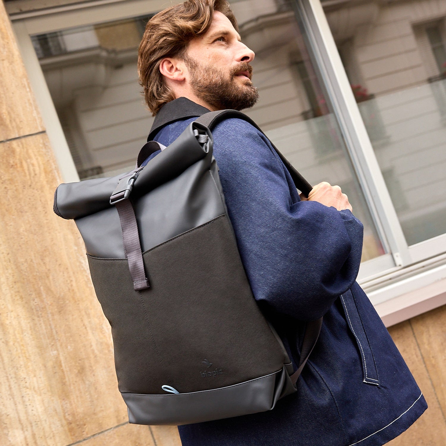 Le sac Antoine est un sac de style "roll top", c'est à dire avec du tissu à rouler sur le dessus, et il se ferme en plus avec une sangle et un clip.